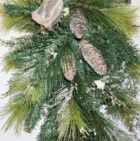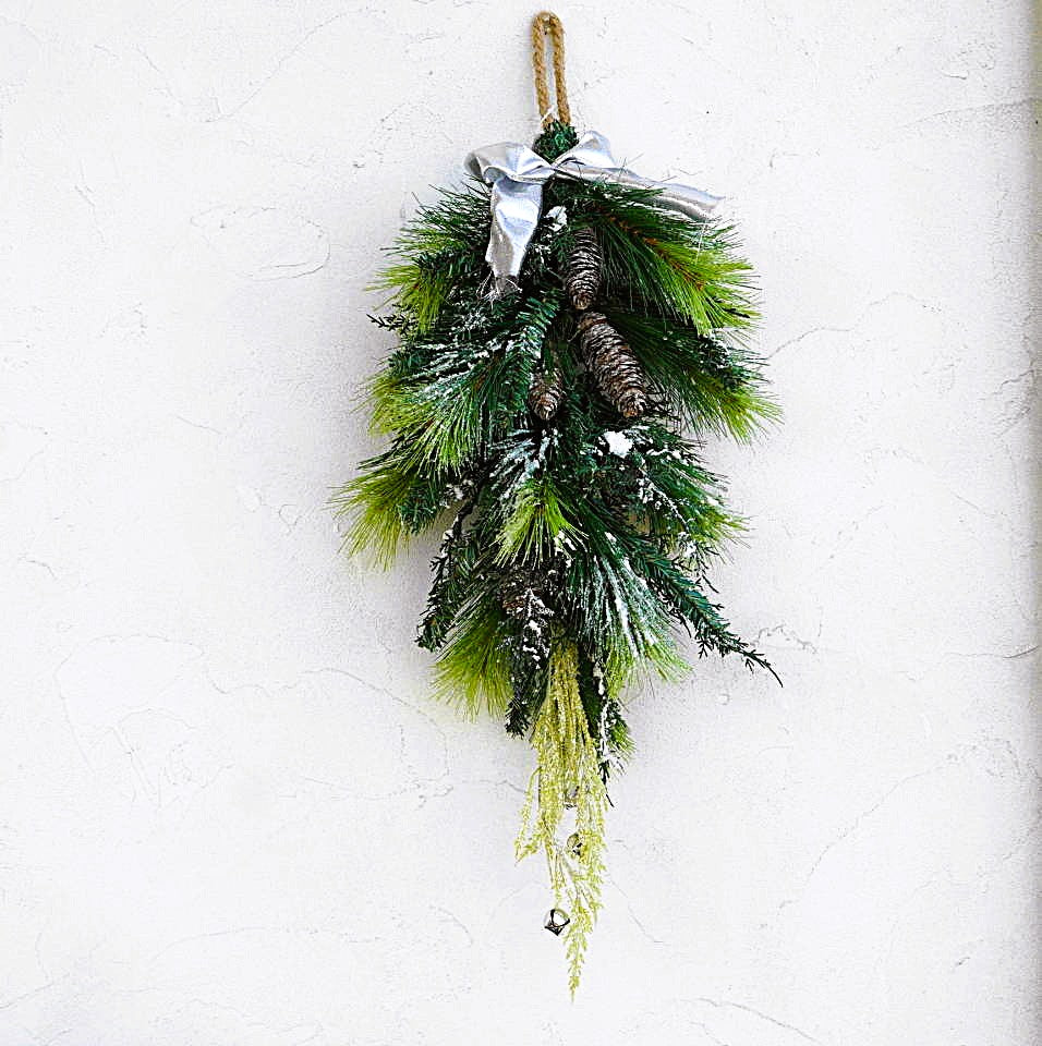 大きなパインコーンと造花のグリーンでボリュームがあります。