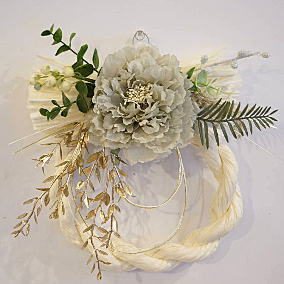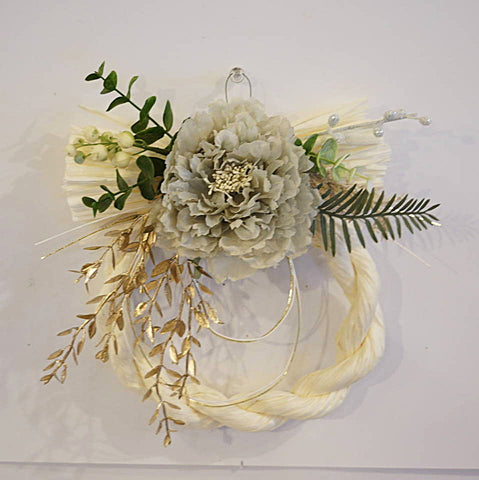 正月飾り しめ縄 おしゃれ 白しめ縄 ぼたん/ピオニー グレイ 造花 洋風 5572